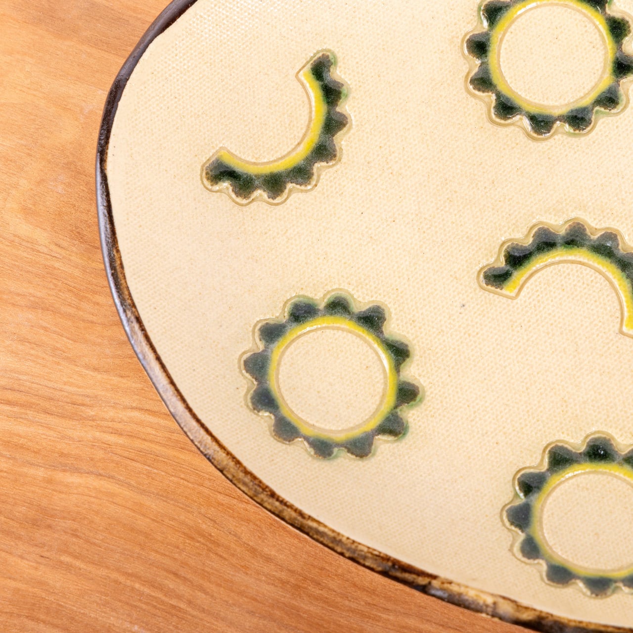 「ゴーヤー」をモチーフにした、沖縄の伝統的な焼物“やちむん”の大皿です。