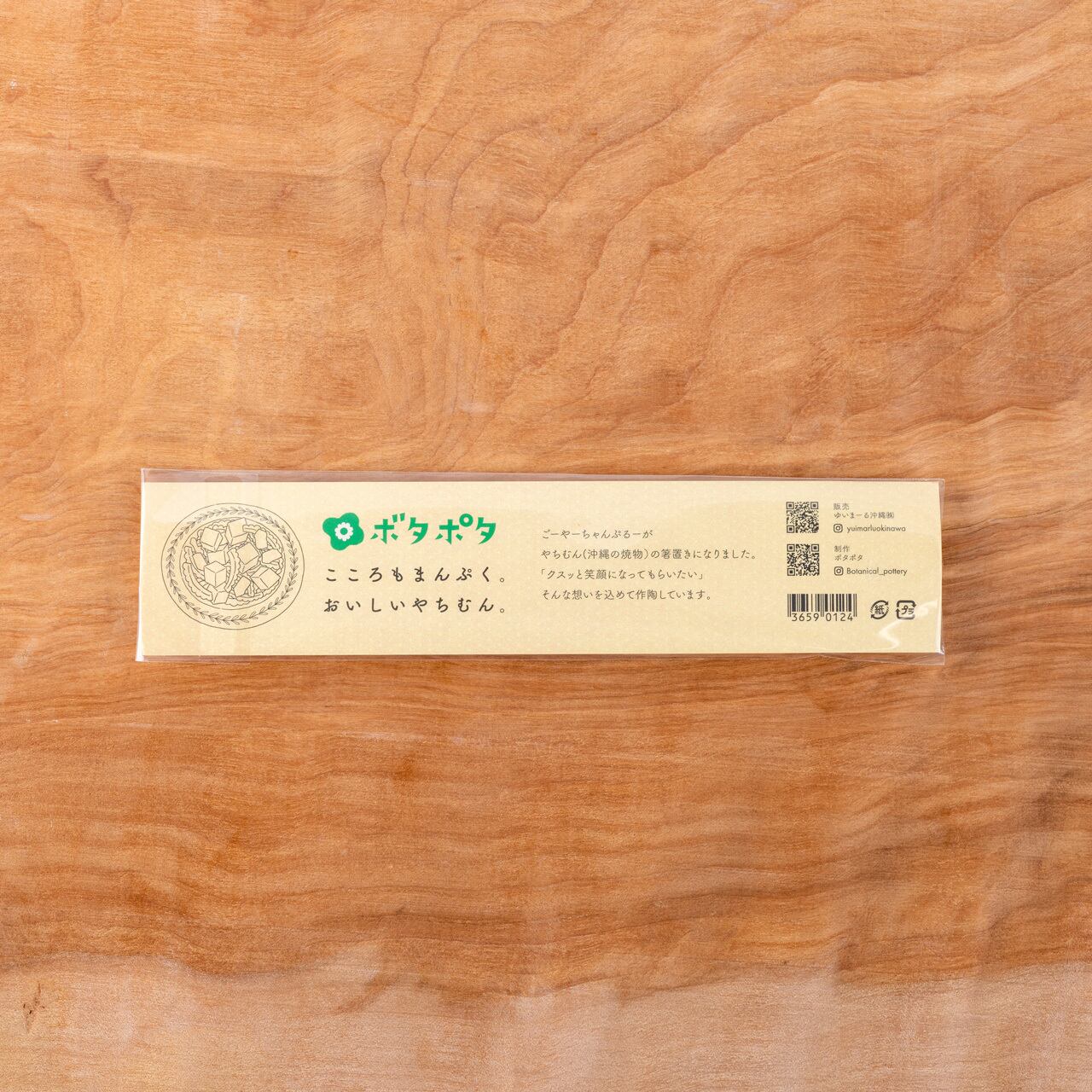 「ゴーヤー」をモチーフにした、沖縄の伝統的な焼物“やちむん”の丸型箸置きと、赤と黄色のカラフルな箸のセットです。