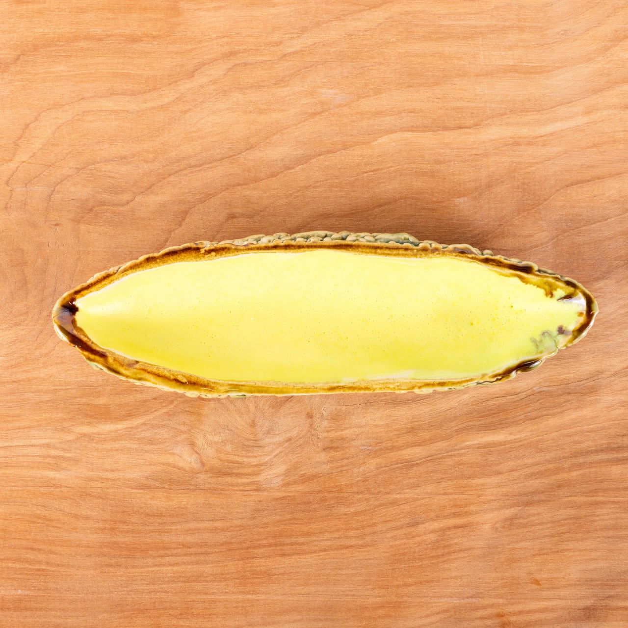 「ゴーヤー」をモチーフにした、沖縄の伝統的な焼物“やちむん”のボート中皿です。