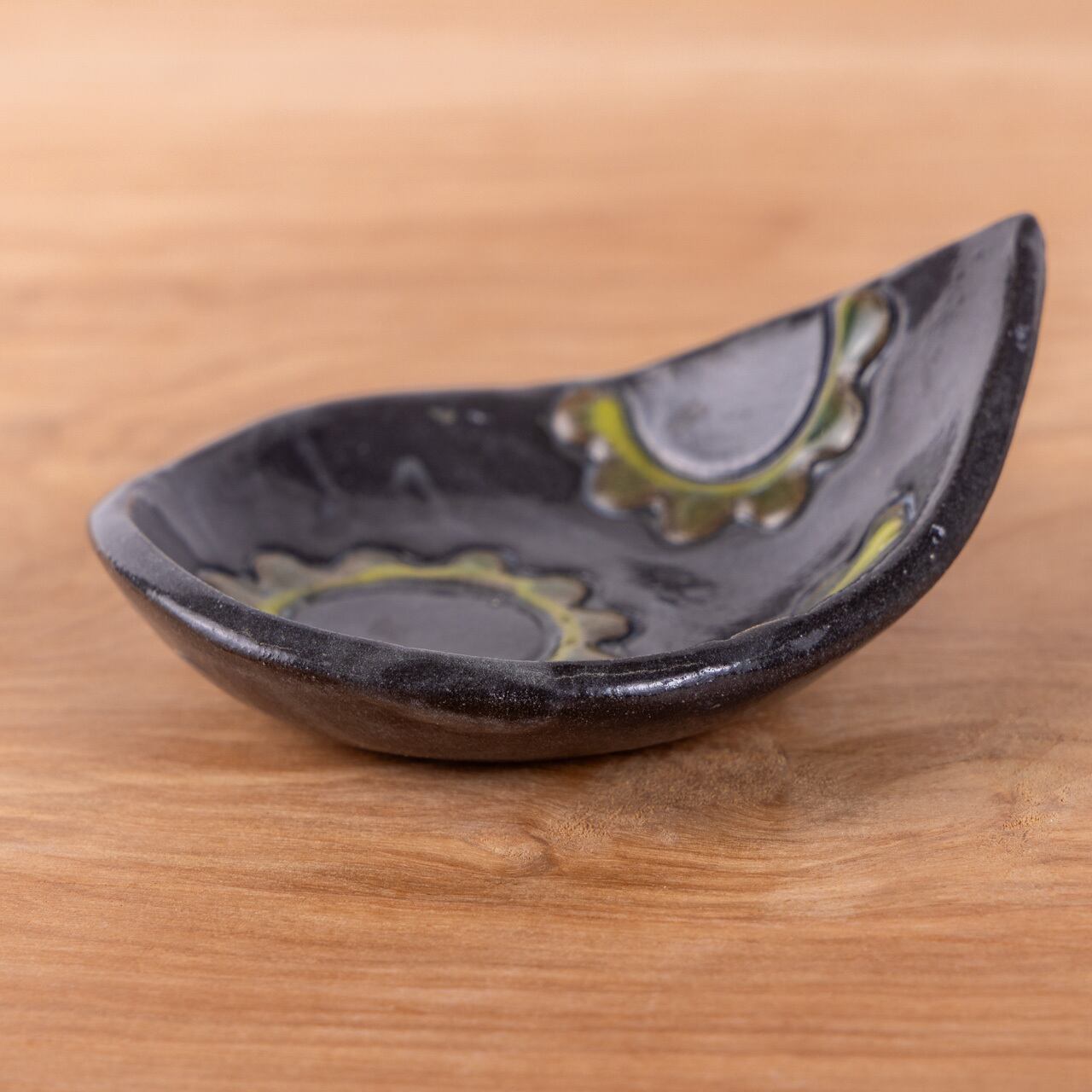 「ゴーヤー」をモチーフにした、沖縄の伝統的な焼物“やちむん”の雫型豆皿です。