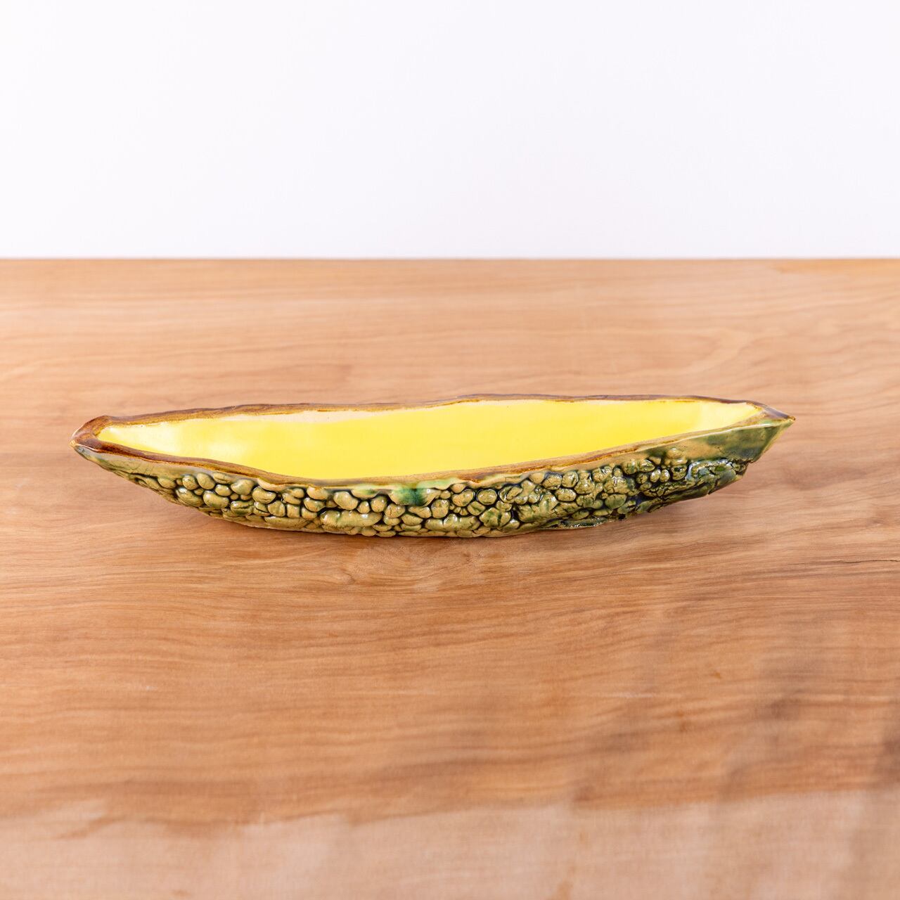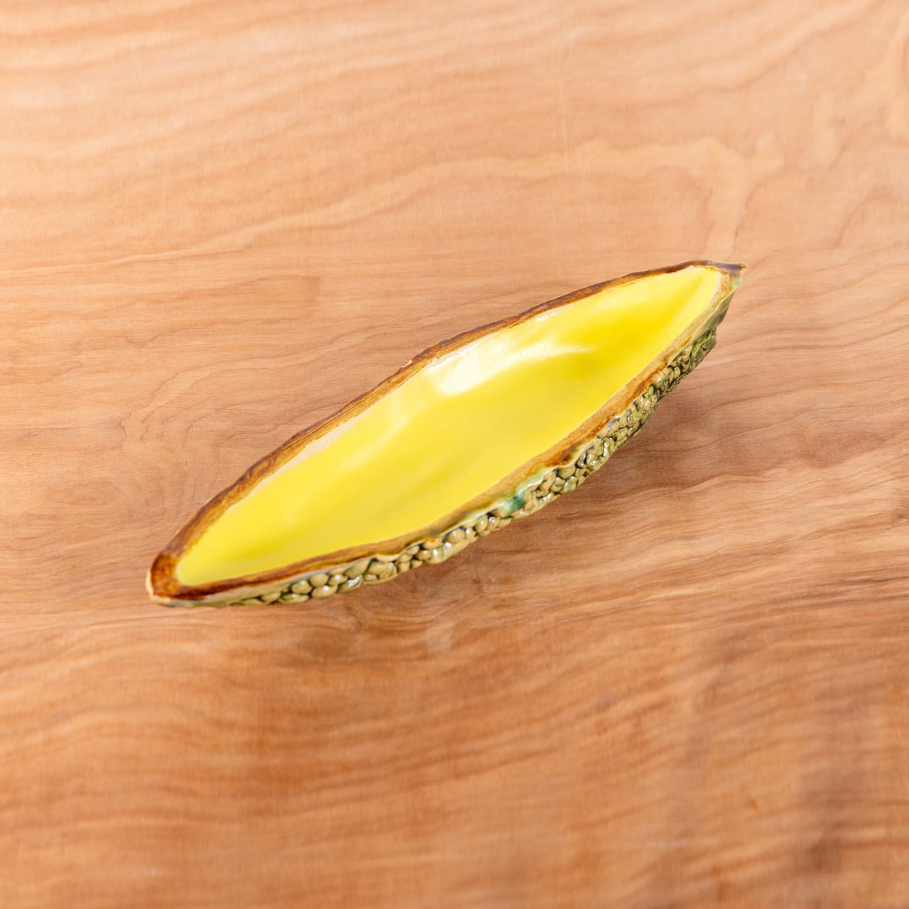 「ゴーヤー」をモチーフにした、沖縄の伝統的な焼物“やちむん”のボート大皿です。